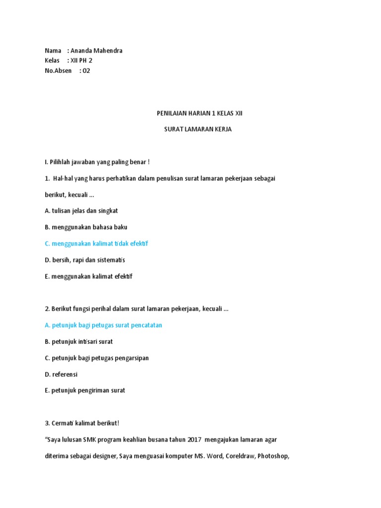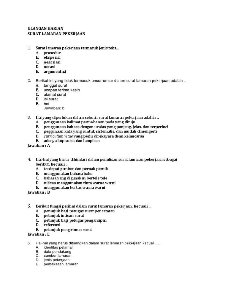 Soal Materi Bab I Xii Part 1 Pdf from imgv2-2-f.scribdassets.com Bagi pelamar, bagian perihal memberikan informasi tentang posisi yang dilamar. Bagian pembuka pada surat lamaran kerja terdiri dari kota serta tanggal surat tersebut dibuat, hal atau perihal, alamat instansi yang dituju, dan salam pembuka. Pada poin ini tentunya sebagai fungsi utama surat lamaran kerja, karena dengan adanya surat ini sebagai bukti permohonan yang resmi untuk melamar sebuah pekerjaan. Tapi sebaiknya anda tidak perlu menuliskan kata kepada. Surat lamaran pekerjaan ini biasanya bersifat formal ataupun resmi, misalnya surat untuk melamar pekerjaan menjadi karyawan ataupun jabatan tertentu sesuai pada iklan yang ditawarkan. Sistematika surat lamaran pekerjaan meliputi: Surat lamaran yaitu surat kepada pihak tertentu baik perseorangan maupun lembaga / organisasi untuk mengajukan permohonan. Melalui surat lamaran, pelamar meminta supaya ia diberi pekerjaan.